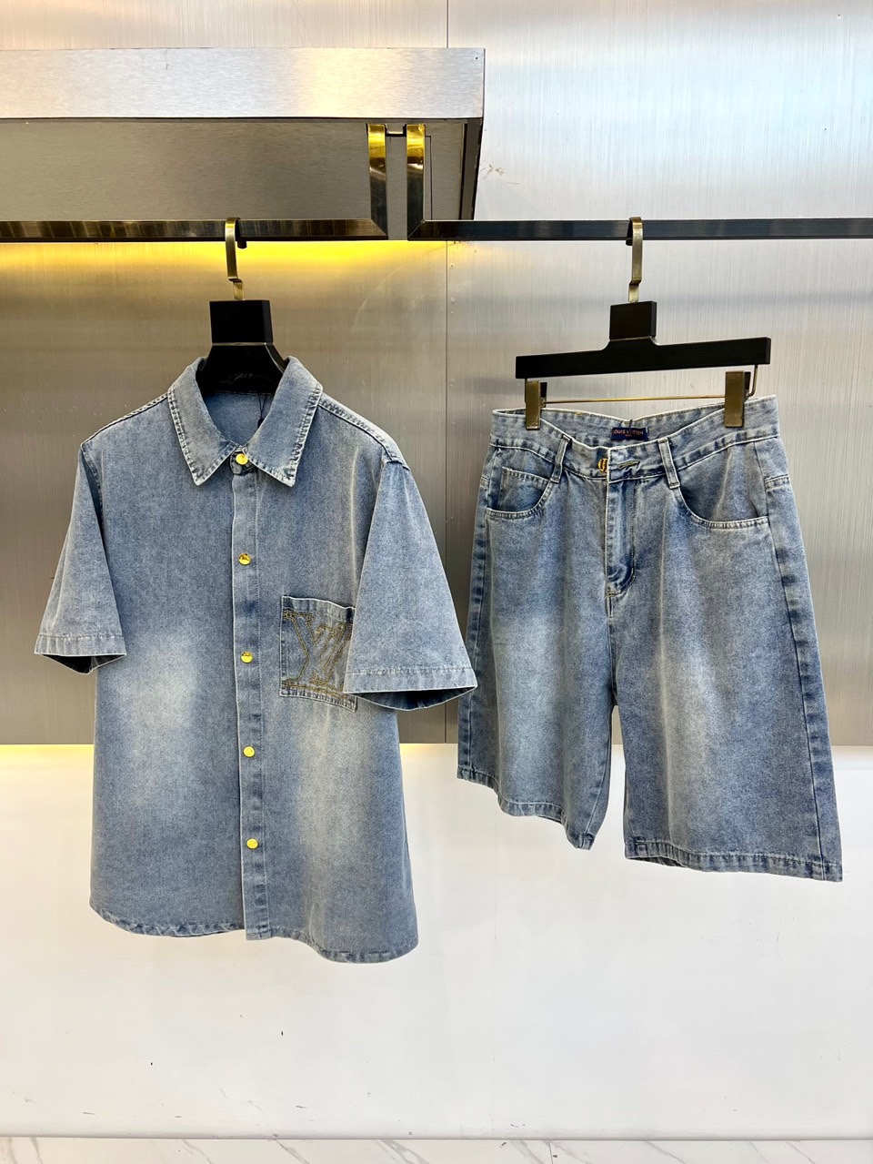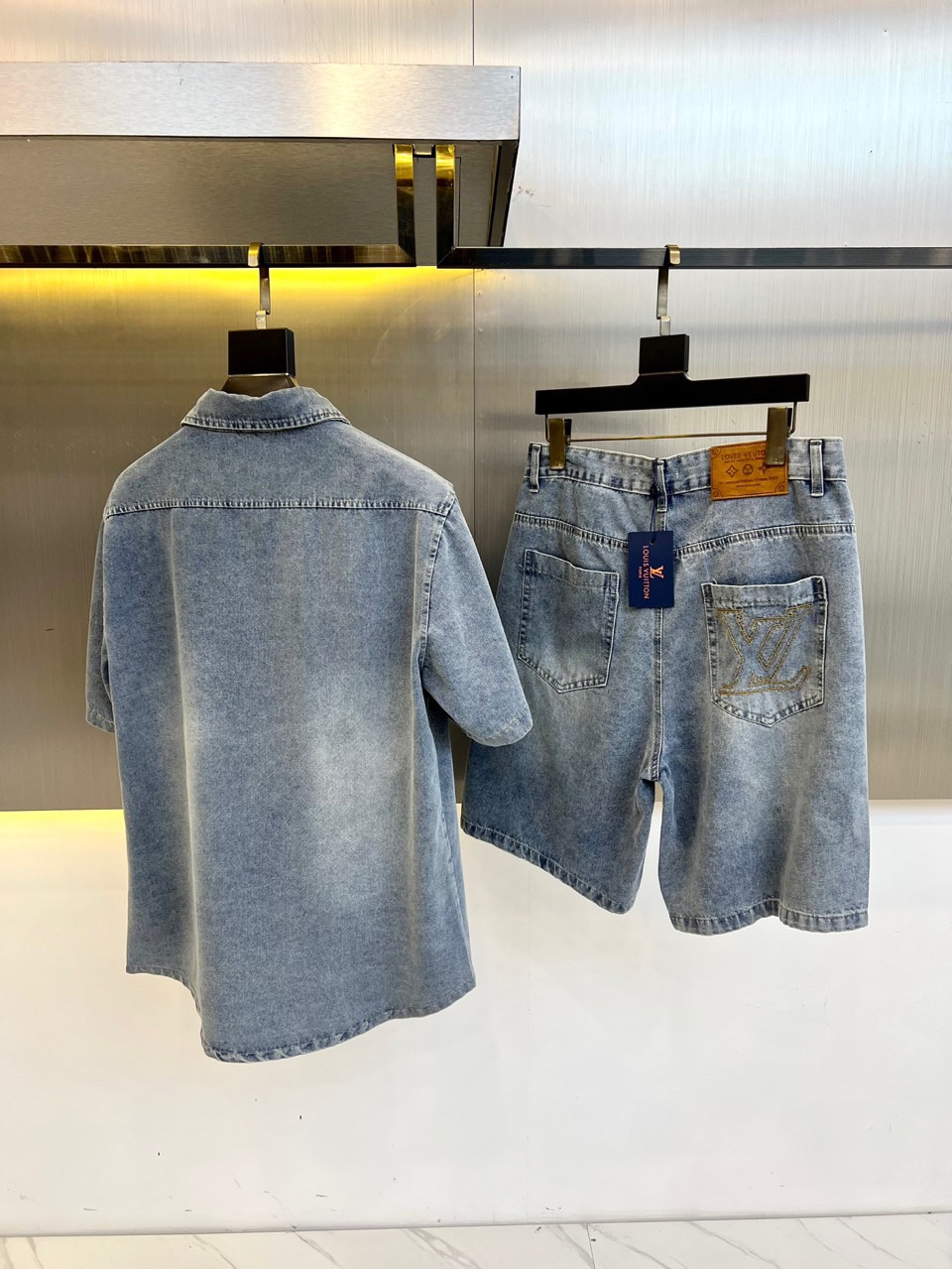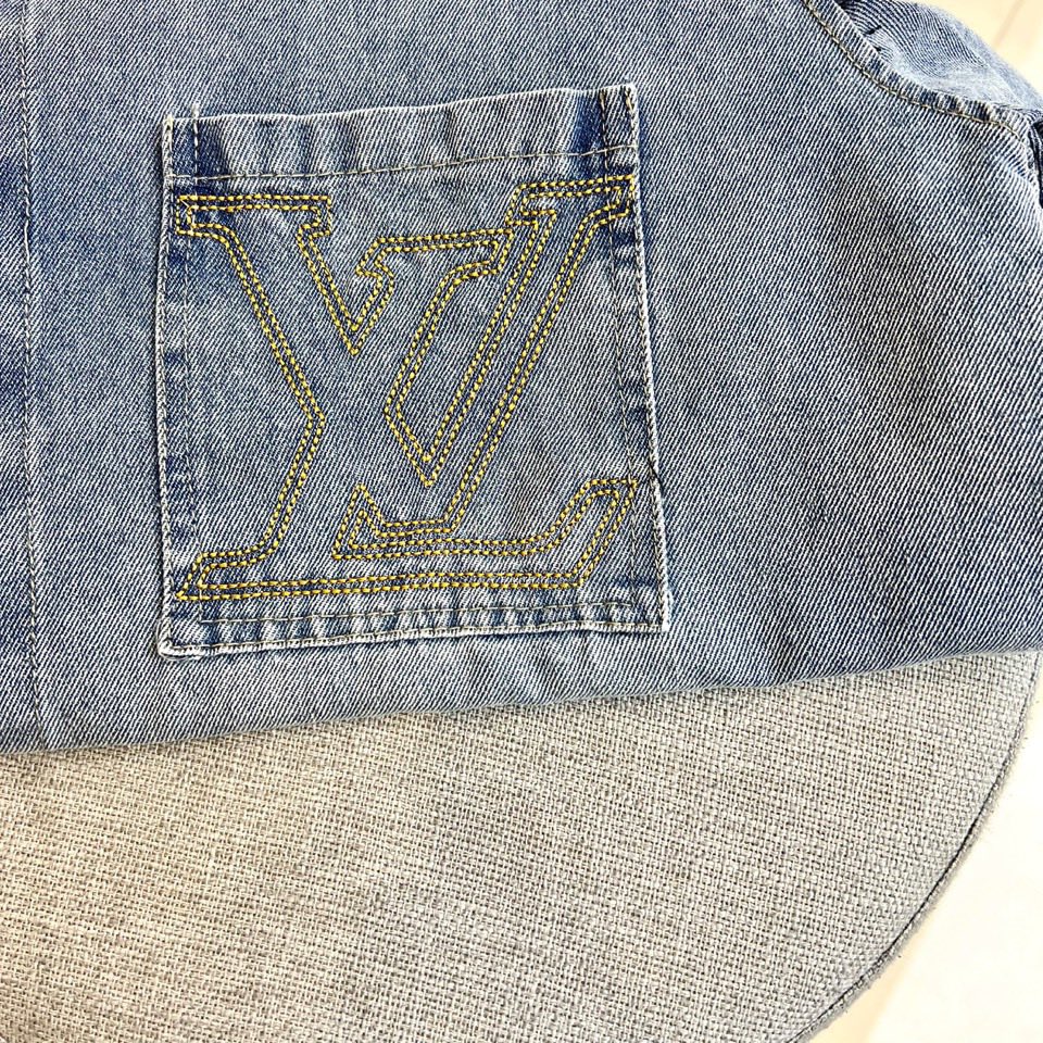 1v Vuitton men's 2025 coat, blue washed cotton vintage short-sleeved denim lapel T+ shorts set. This denim jacket elegantly reinterprets the essential mid-season silhouette. Made of washed denim, the front and back are decorated with strikingly contrasting embroidered logos, which are very detailed and create a unique distressed effect. This dress can be paired with the matching shorts to create a fashionable look. Fabric :100% cotton color: Classic denim color, complete three standards, excellent cut. 48-56 (Please report your height and weight when placing an order)