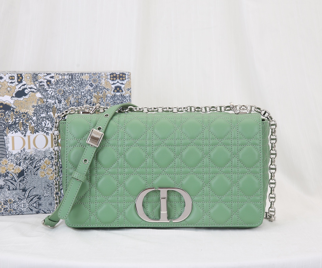 Dior's large inner lining is made of imported sheepskin The Dior Caro handbag is elaborately crafted from green silver-buttoned cowhide and decorated with the signature rattan checkered stitches. The material is soft. The flip cover is decorated with a retro gold finish metal "CD" clasp, inspired by the seal of Christian Dior perfume bottles. The small-sized style comes with a detachable signature "CD" chain shoulder strap, which can also be replaced with an embroidered wide shoulder strap for a more elegant and fashionable look. Whether it's a daily look or a dinner party Dimensions: 28x17x9CM