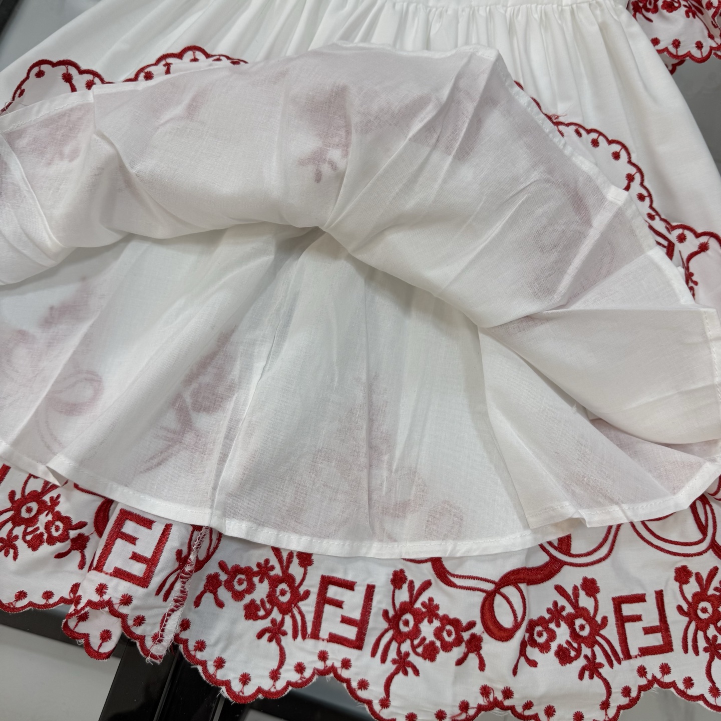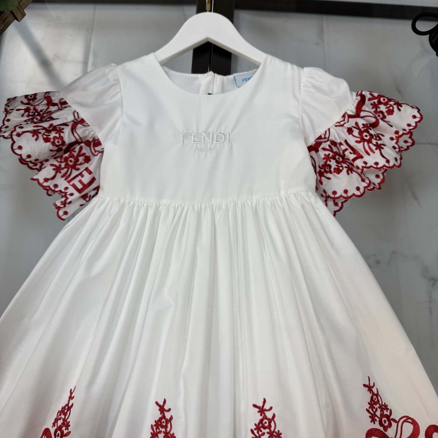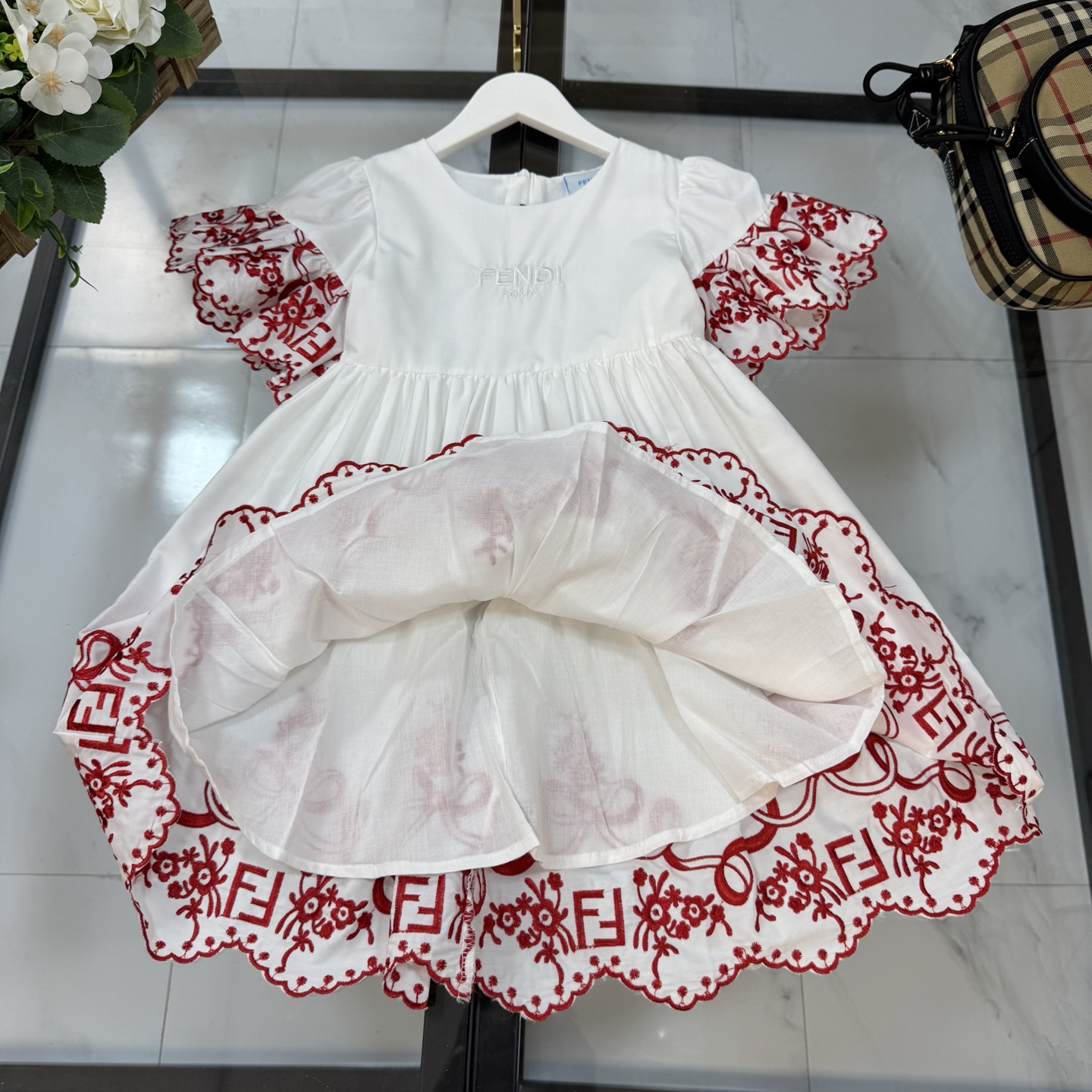 Fendi, high-end children's clothes, girls dress, double layer design, outer woven cotton, cotton, inner outer skirt FF embroidery ?? wine red color, body comfortable, good-looking, code number: 100/110/120/130/140/150 cm