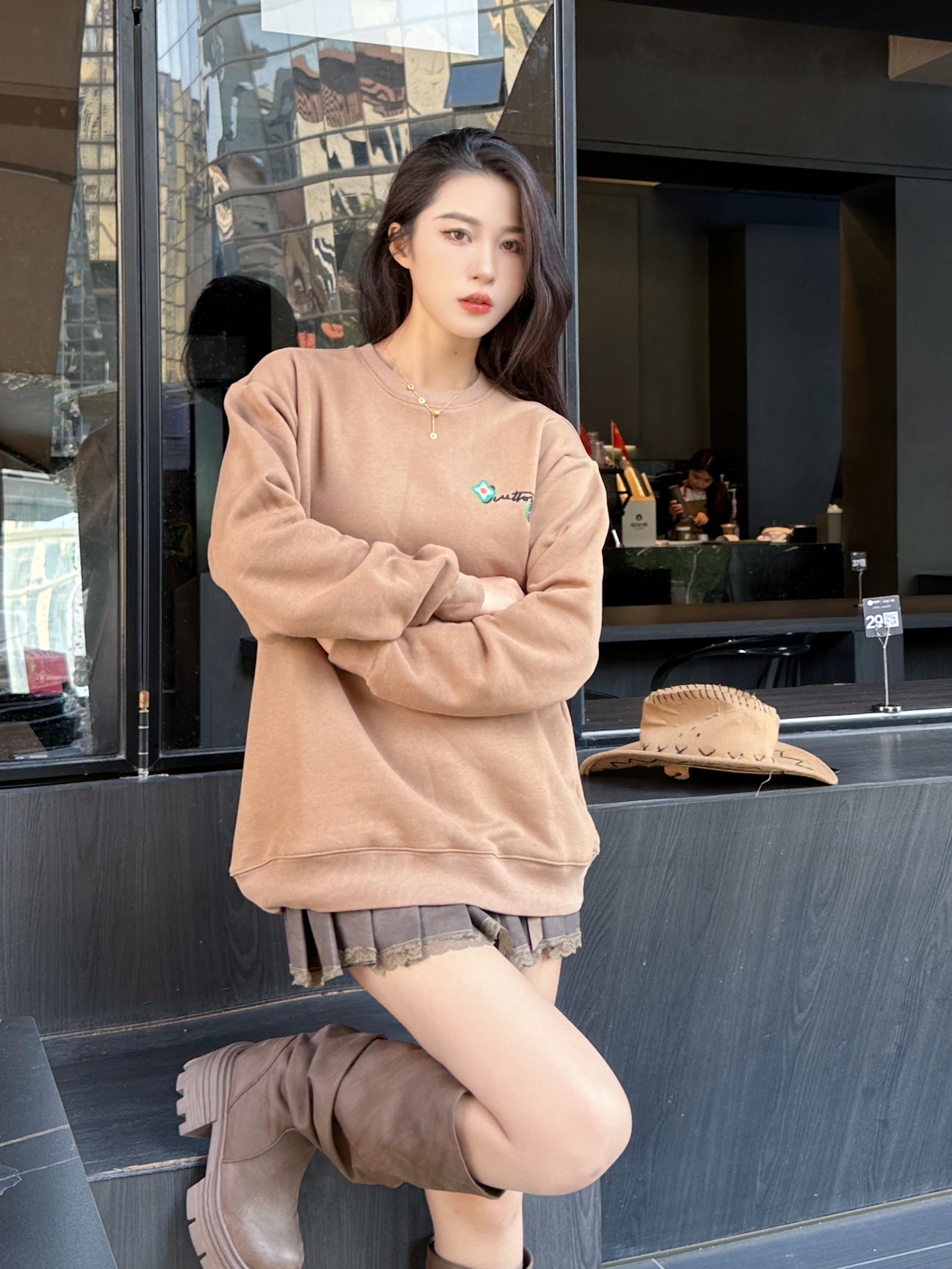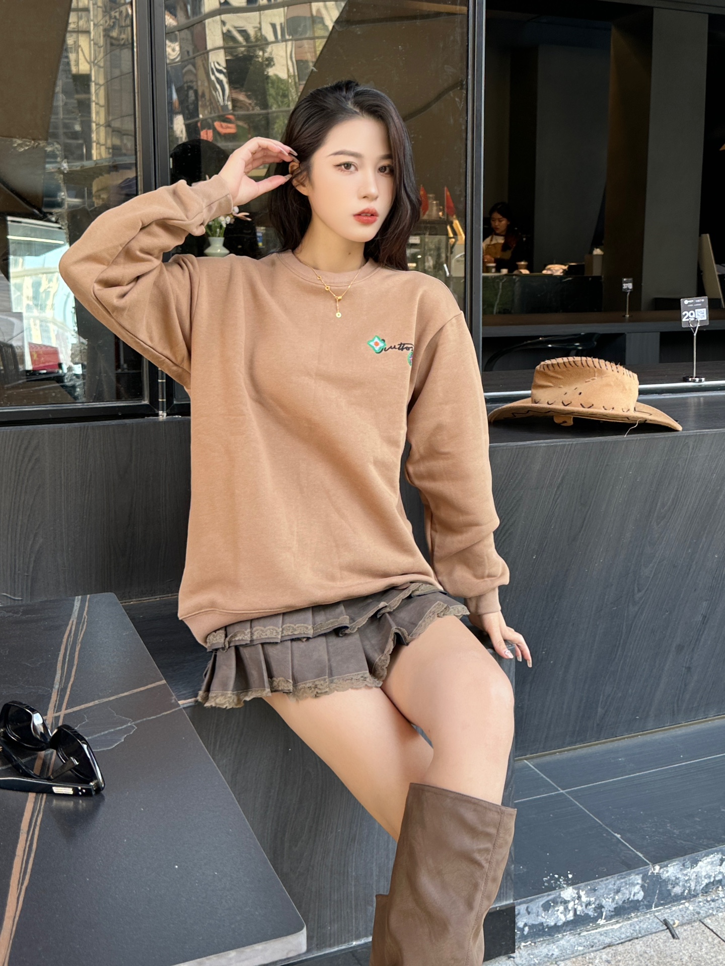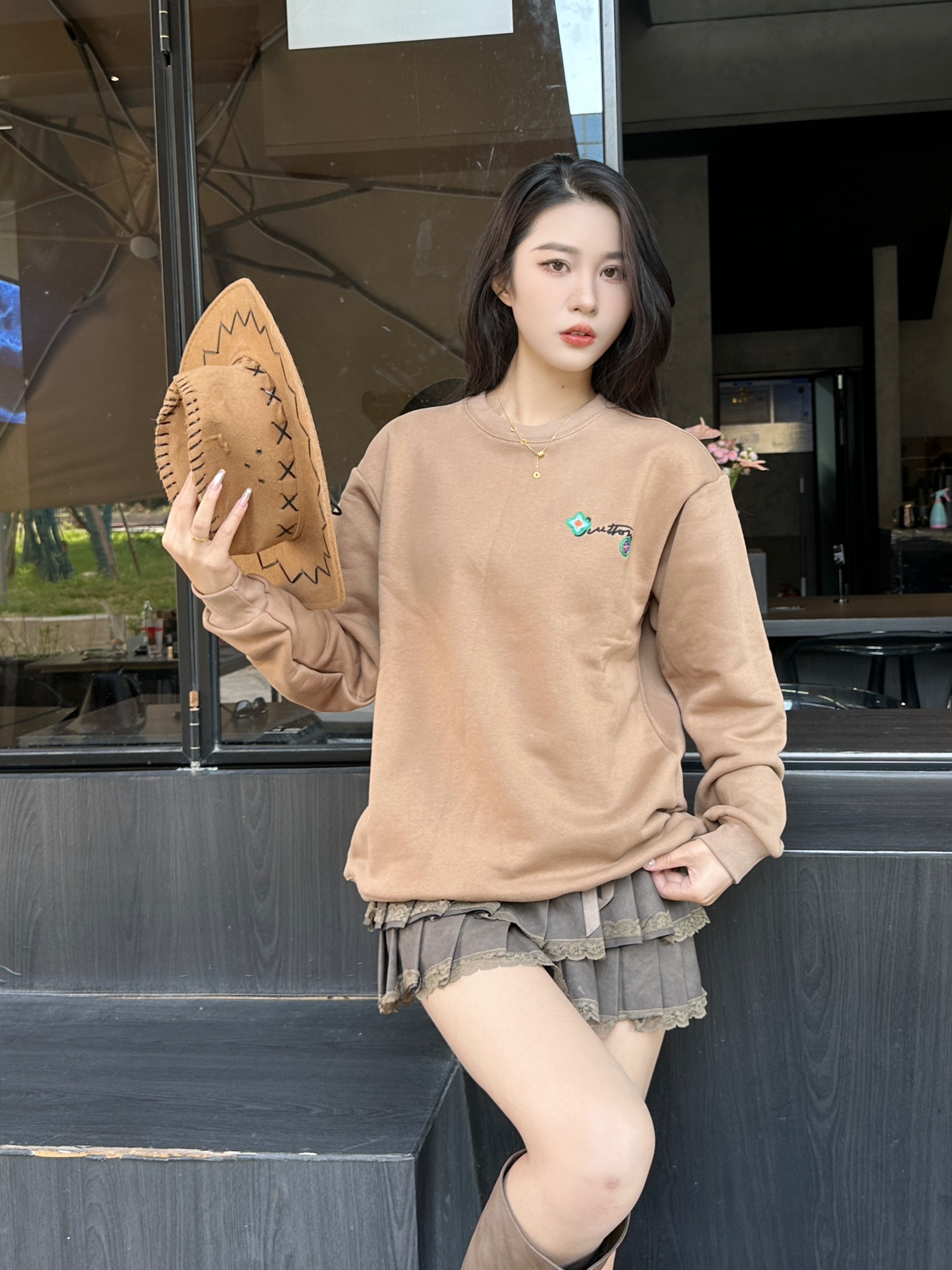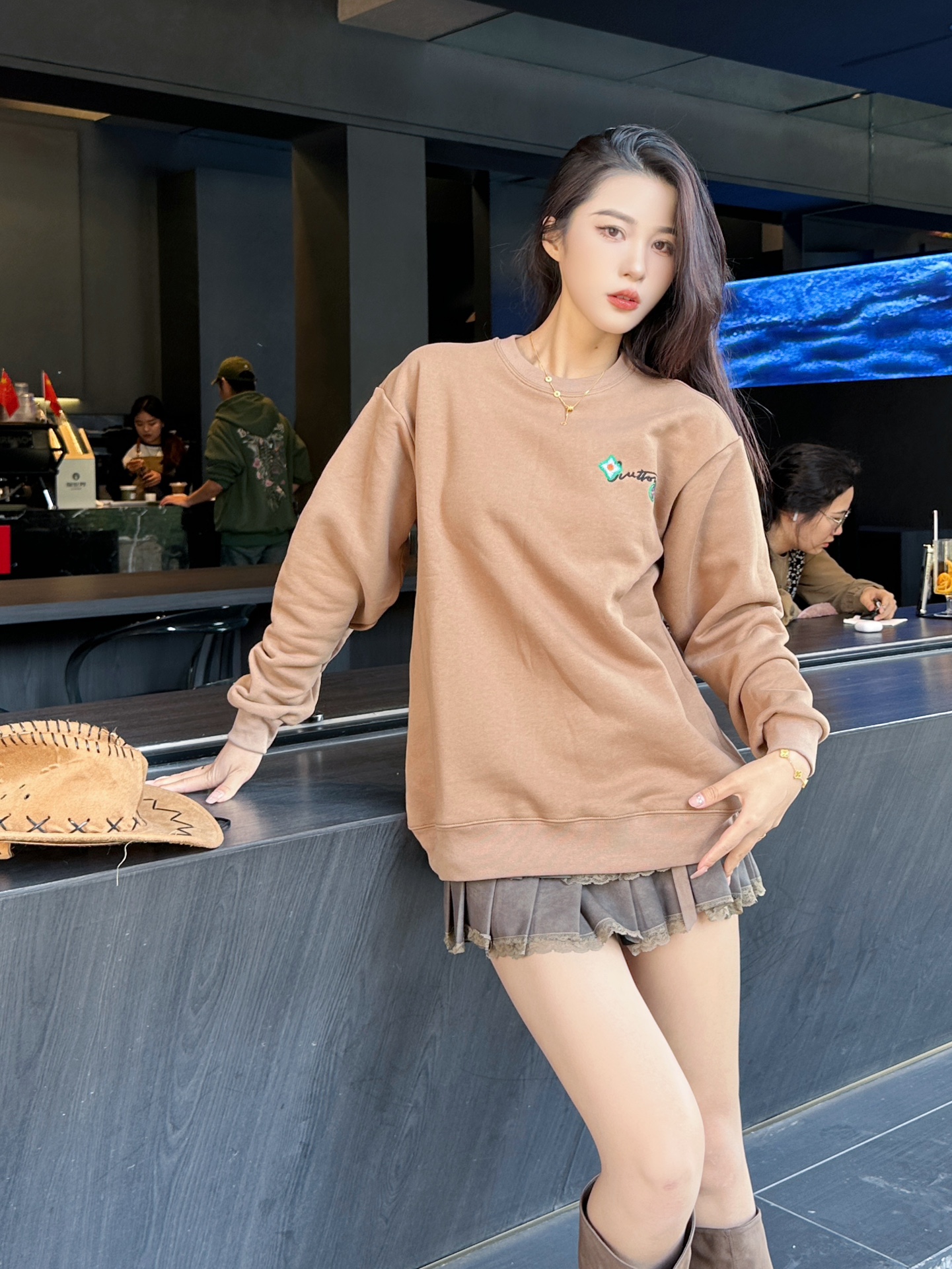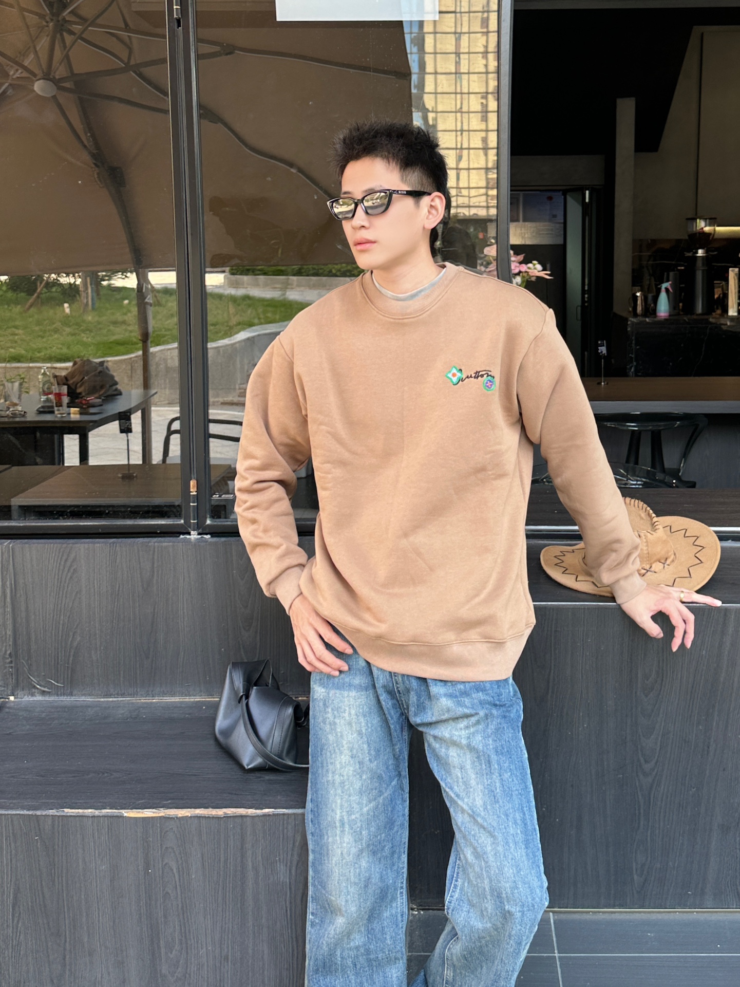 The wearing effect of the Louis Vuitton 24Fw floral letter embroidered round-neck sweatshirt #