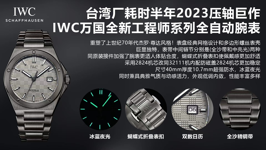 It took half a year to complete the grand finale of 2024. The new IWC Engineer Automatic 40 reinterprets the Jero of the 1970s. Zunda style! The classic grid design of the dial and the polygonal screw case are extremely unique. The middle links of the strap are available in two types: full sand strap and medium bright light. The original connectors enhance the watch's comfort and fit. The butterfly-shaped folding clasp makes the wearing experience more comfortable. The 2824 movement is modified from the 32111 movement with an anti-magnetic cover inside, making the 2824 movement more stable!! With a size of 40mm and a thickness of 10.7mm, it features super water resistance, ice blue luminescent light, and combines elegant charm with dynamic vitality. Its appearance is understated and reserved, while its performance is rich and diverse. Emphasis (Every watch from the factory has been fitted with super WATERPROOF)????