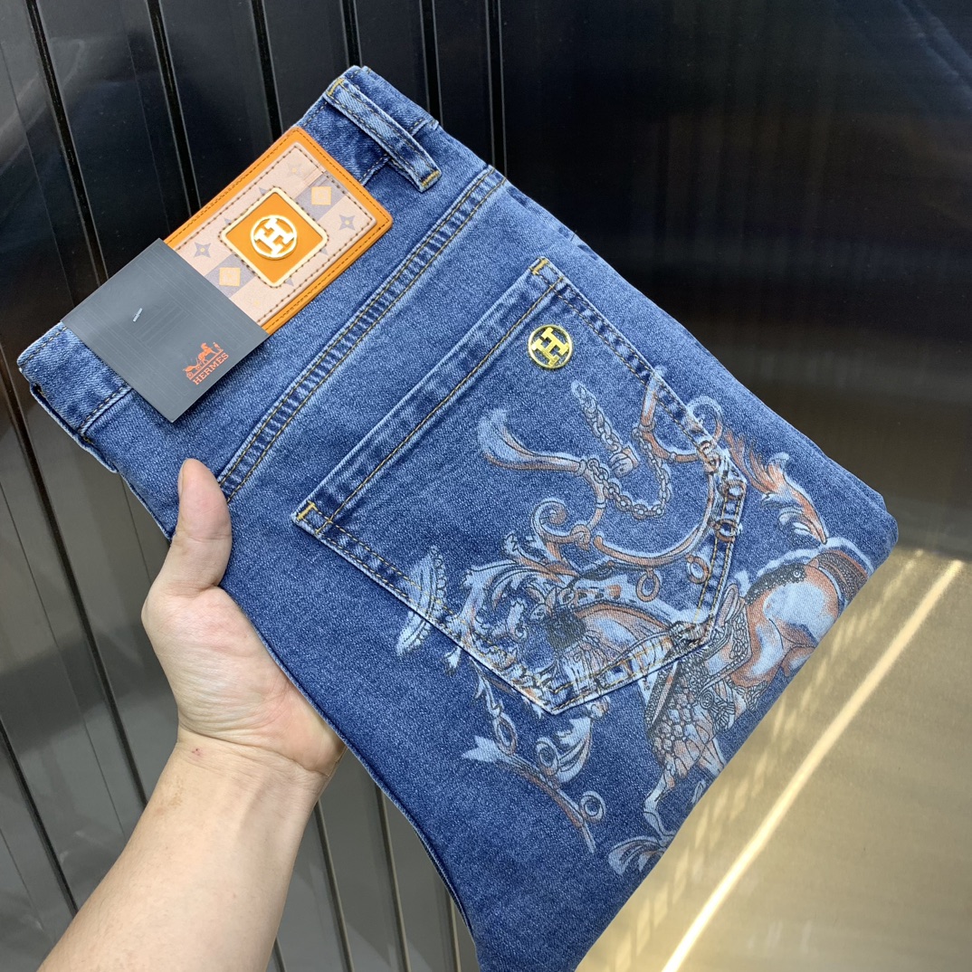 The fabric of Hermes' new men's jeans in 2025 is highly elastic. Exclusive sale on the official website, with fashionable, elegant and heavily crafted design. This product is made with the original color yeast washing process, carefully selected imported heavy denim fabric, and decorated with counter hardware. It is a genuine leather brand with exquisite stitching and a high-end style, making it worth having. Size: 28-38, shipped the next day