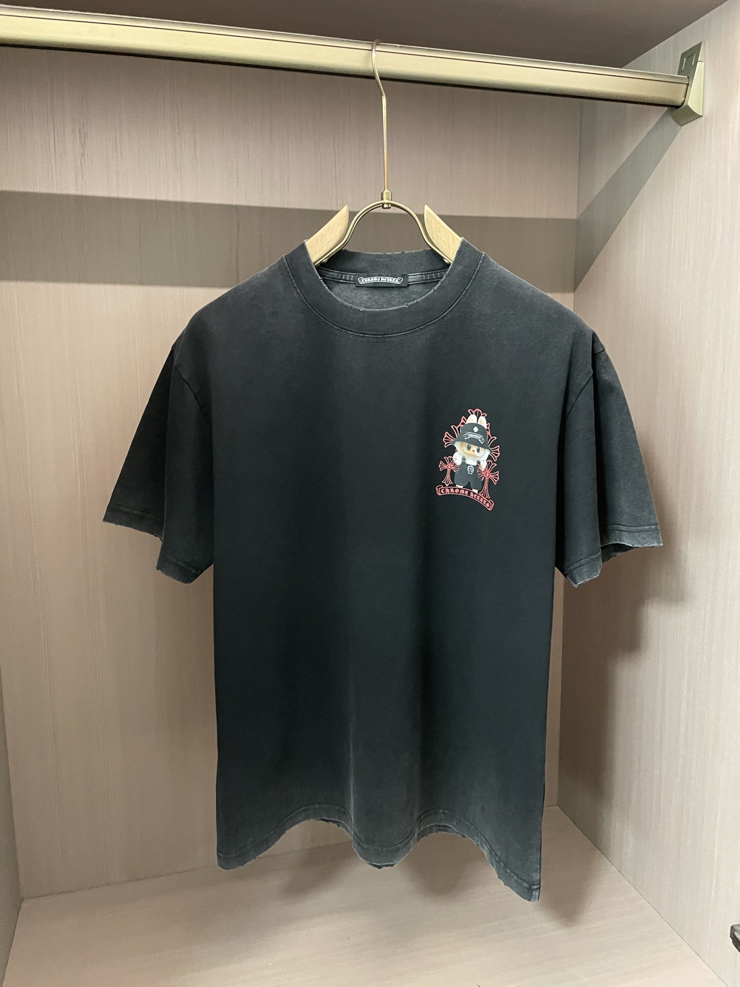 Who can understand the contrast between Kloxin and Labubu? Chrome Hearts is causing trouble again! Combining Labubu with the classic cross of Croix, aged washed, this wave of contrast directly captures ?? The aged black T-shirt comes with a retro filter. The large pattern on the back is "Soft and cute + hardcore Crochet Heart", and the small label on the chest echoes the details. The loose fit is both muscular and street style Pair it with shorts to play the "disappearing bottom" game, and pair it with jeans to go for a retro and trendy style. The washed texture becomes more and more charming as you wear it over time. Krosin fans are overjoyed! ?? ? #ChromeHearts Outfits # Trendy T-shirts # Retro and Aged # Fashion Contrast Size m-xxl