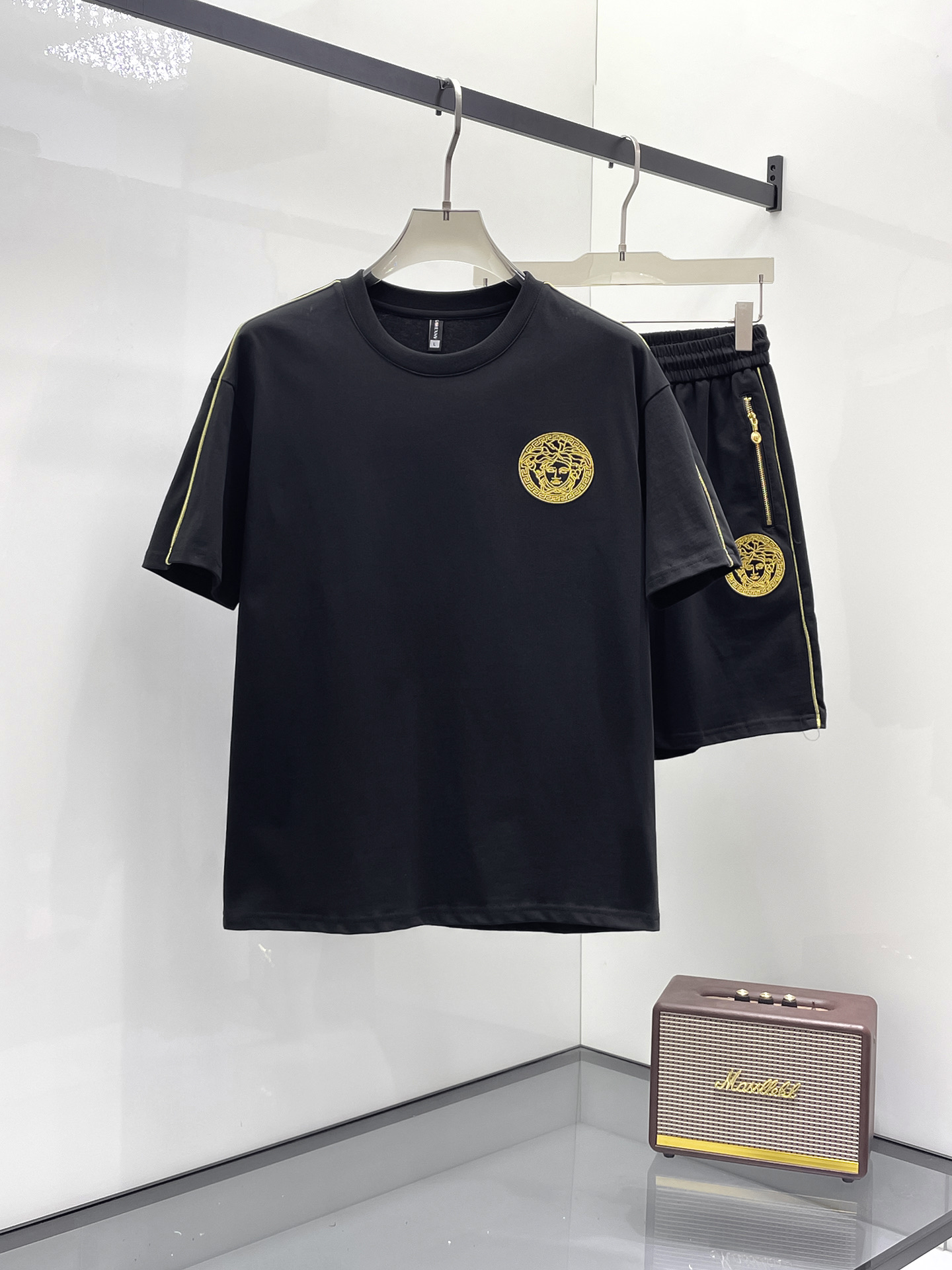 Versace 2025ss Spring/Summer New Casual short-sleeved and short-shorts Set! The casual set with a fashion flavor that celebrities love the most is simple and elegant. The official website features a 1:1 craftsmanship design! The clean and neat cut exudes a strong urban style. Exclusive top-quality custom fabric is available. The hand feel is soft, dry and comfortable, and the wearing effect is crisp and stylish. The three-dimensional cutting process and the pattern are all of high standards, with appropriately sized silhouettes! It's not tight at all. Wearing it makes you feel good. With so many top-quality raw materials, it creates a high-end product with unparalleled value. It has all three standards and is the first choice for high-end, trendy and fashionable people. The wearing effect is super nice! Size: M-3XL