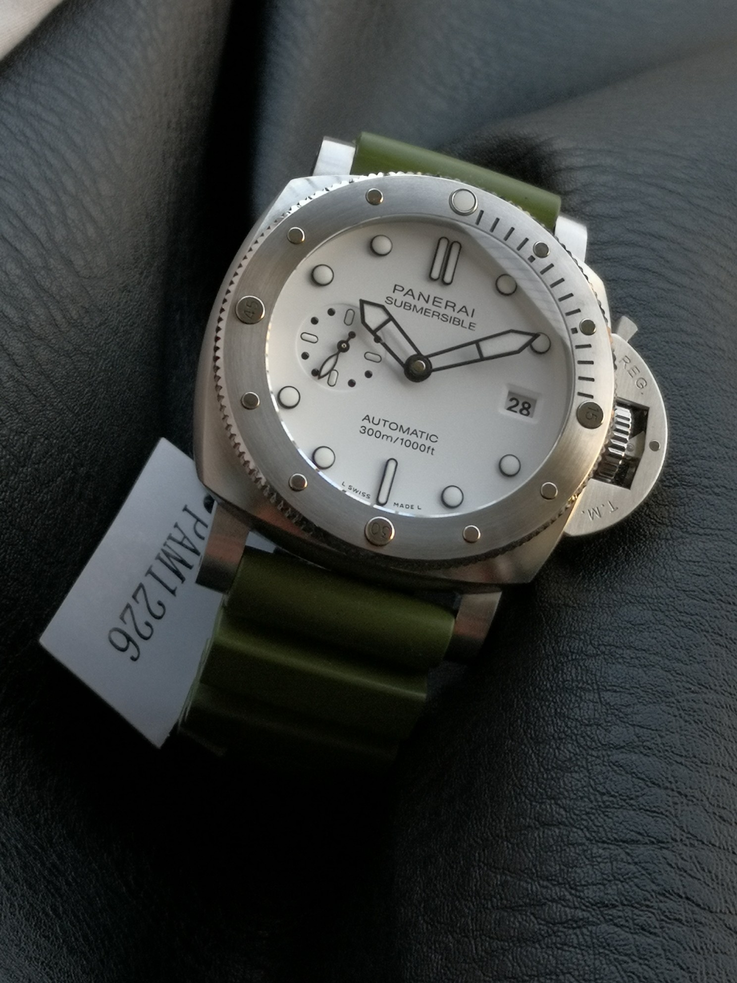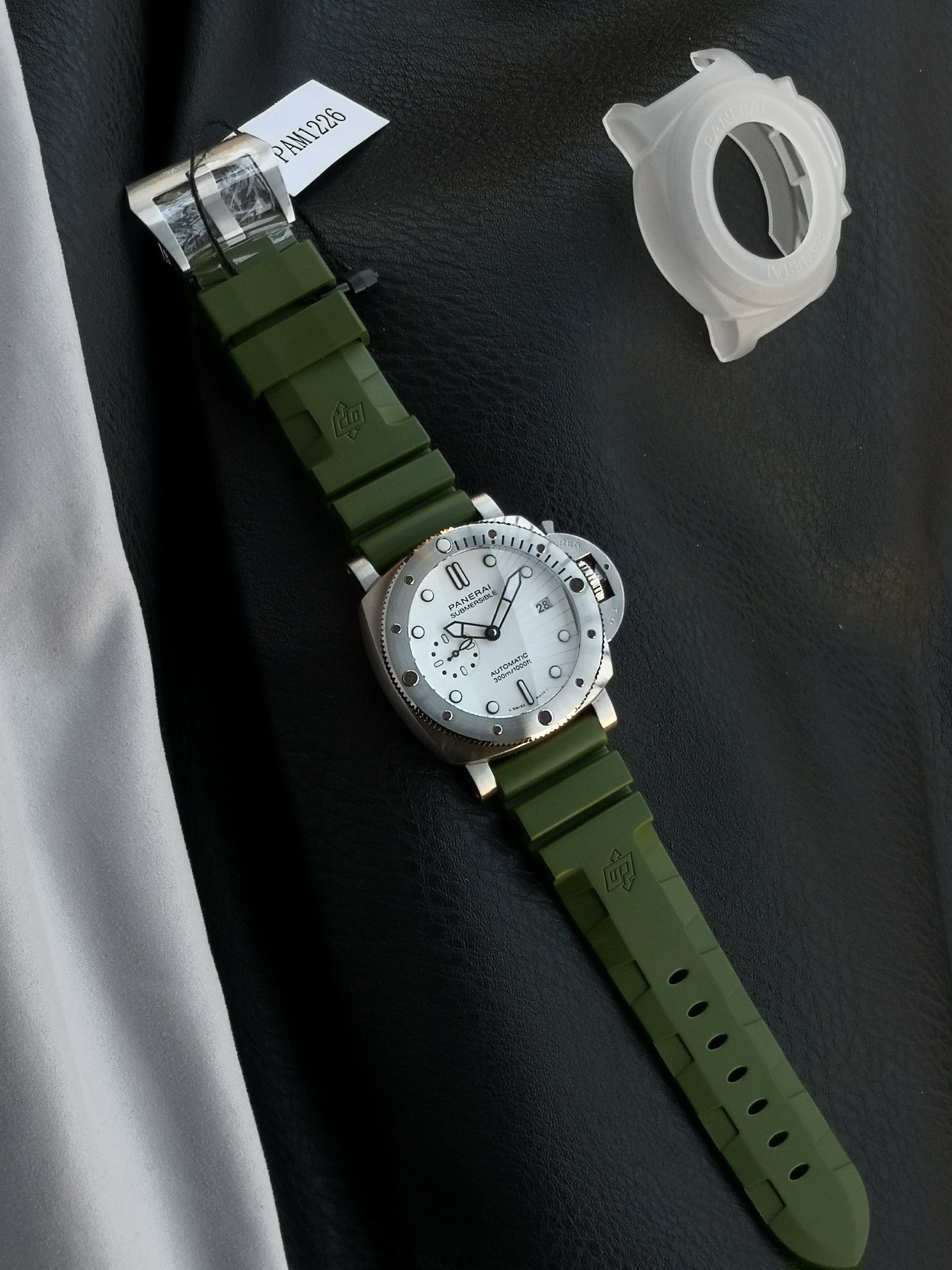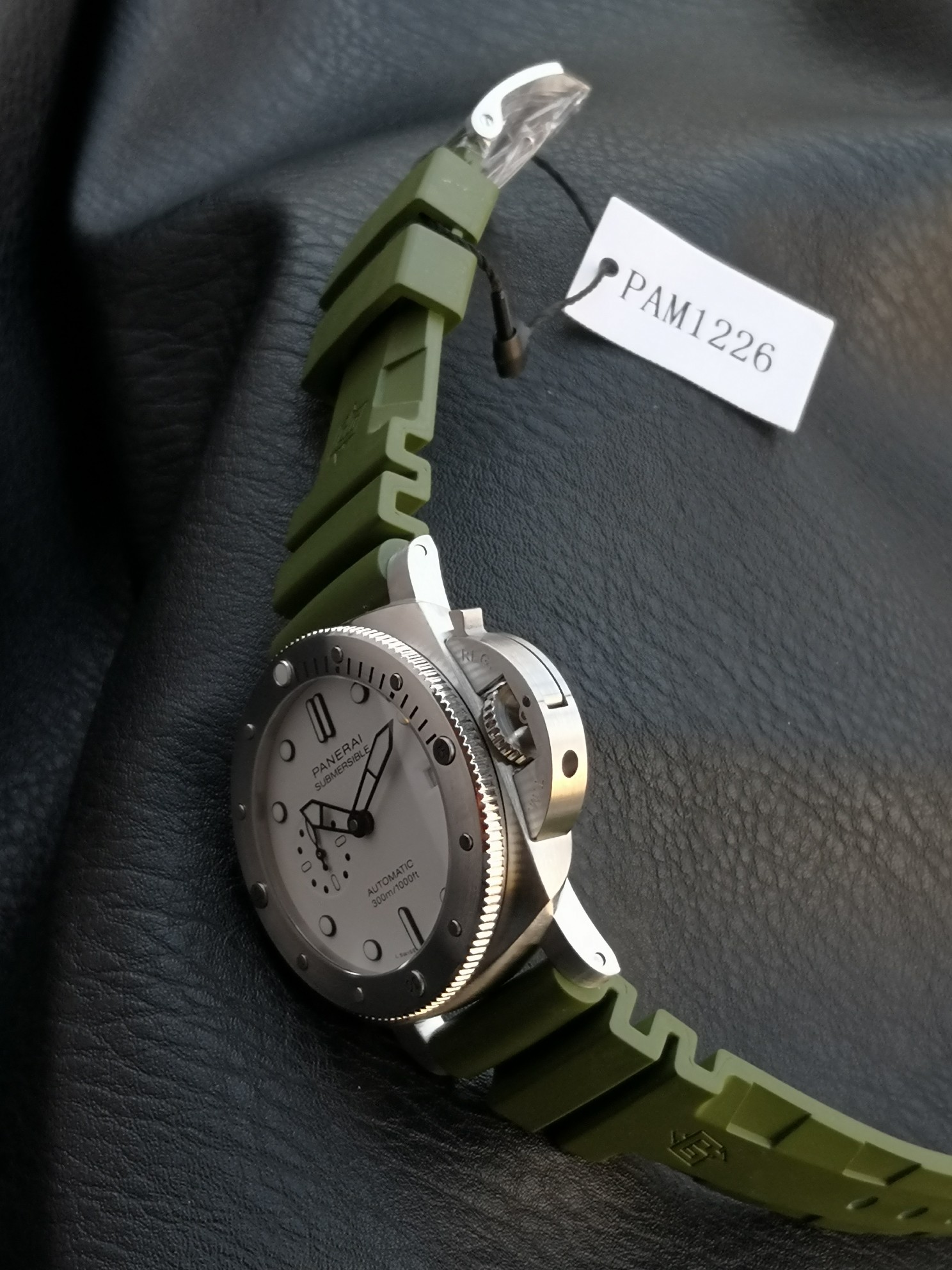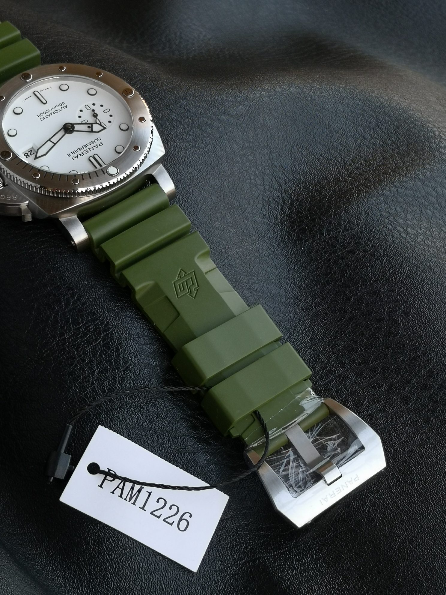 Panerai Submariner PAM01226 watch, with a brushed stainless steel case and a military green natural rubber strap White dial, equipped with P.900 automatic mechanical movement, size: 44 mm.