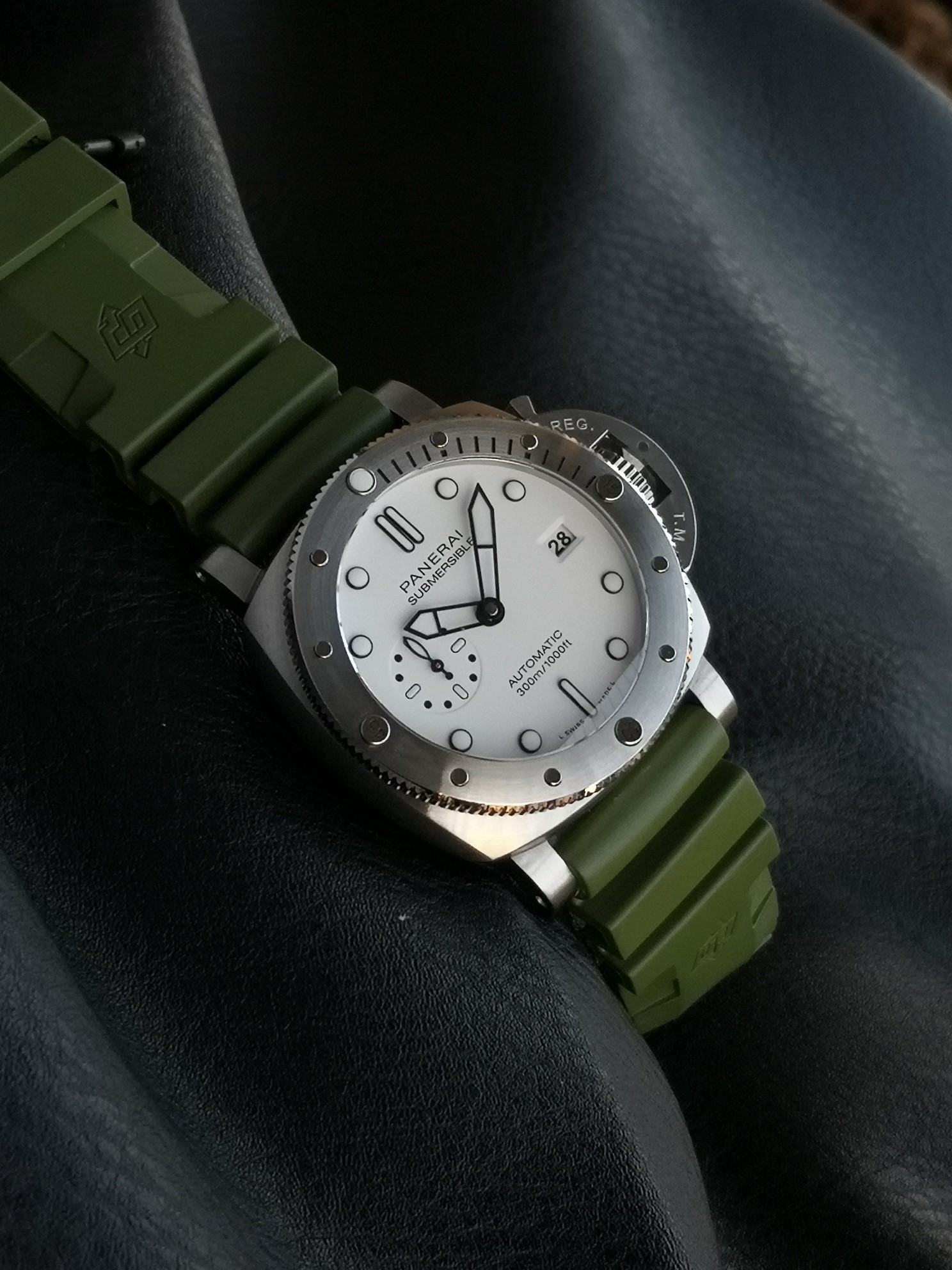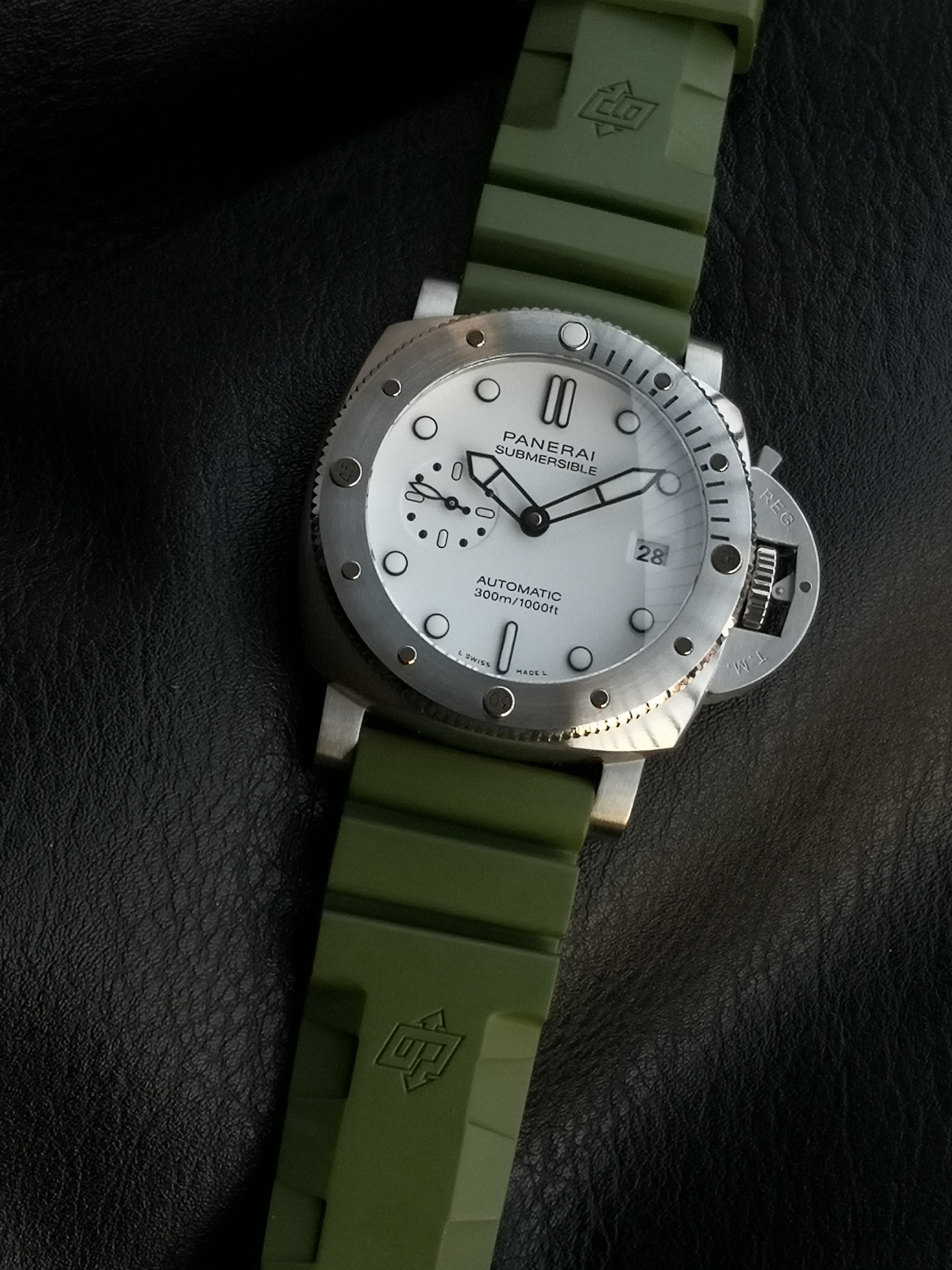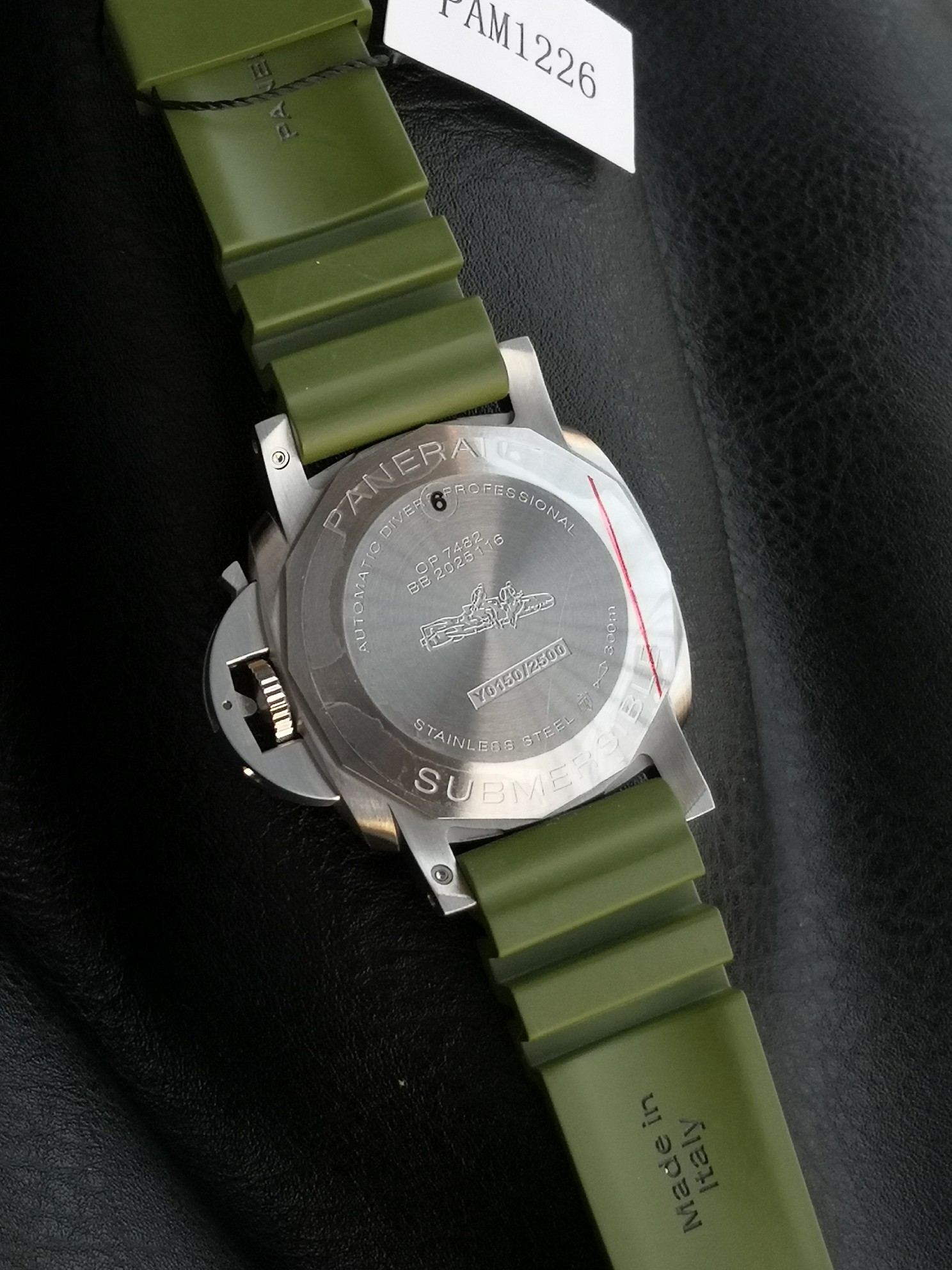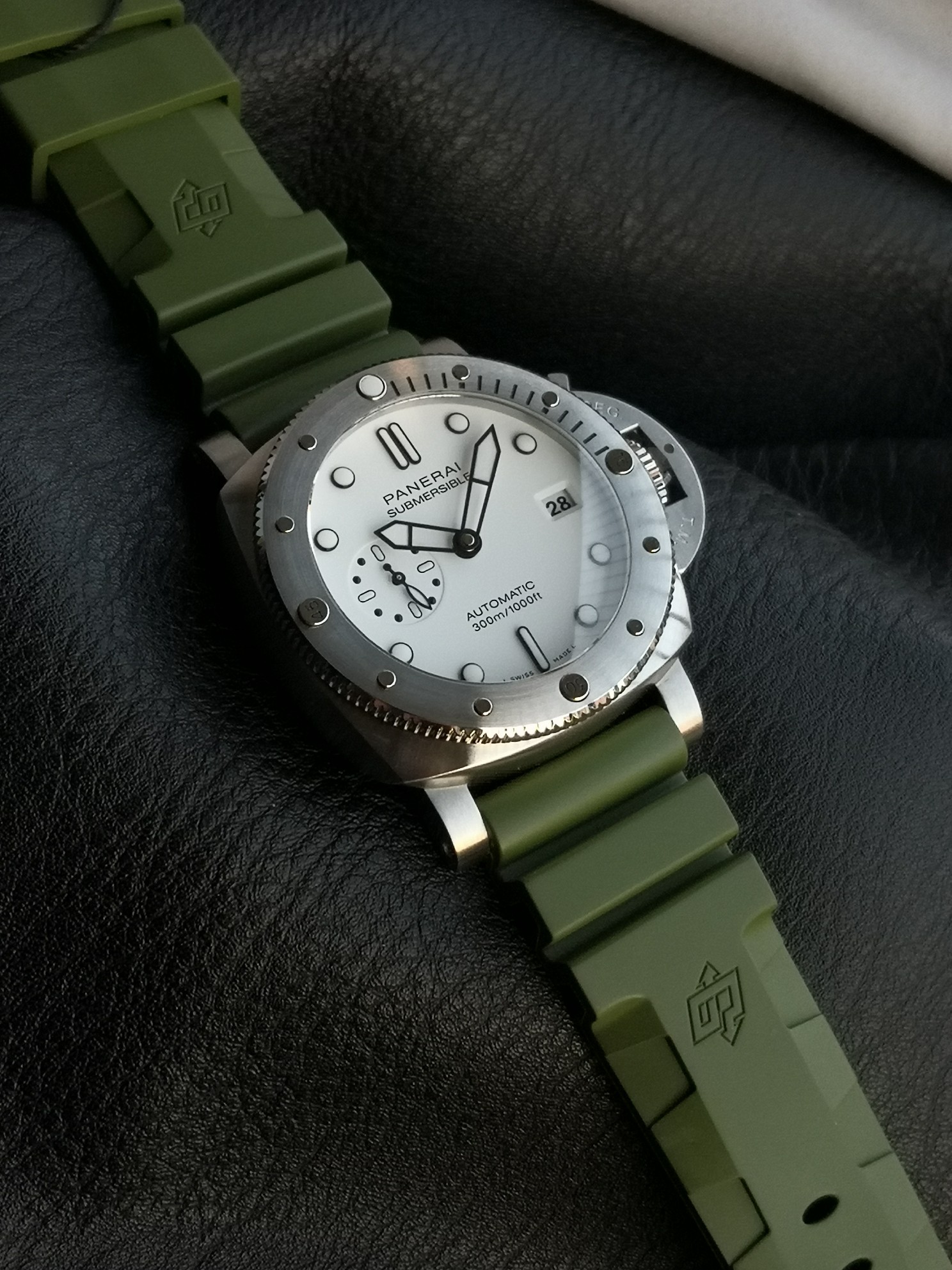 Panerai Submariner PAM01226 watch, with a brushed stainless steel case and a military green natural rubber strap White dial, equipped with P.900 automatic mechanical movement, size: 44 mm.