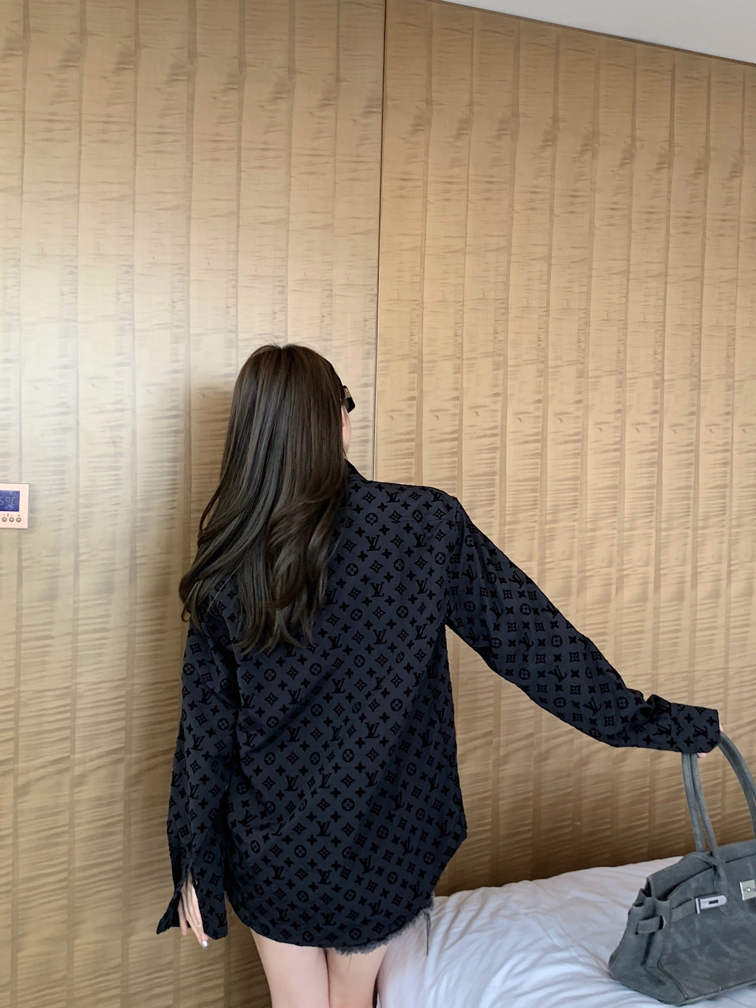 The wearing effect of the Louis Vutton long-sleeved shirt with the full-printed flocked LOGO #